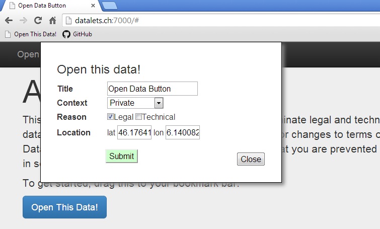 This project aims to help lift legal and technical restrictions on data, and get rapid community response to changes in terms of use. The Open Data Button, installed as a browser bookmarklet, is an easy, social way to share the fact that you are prevented from accessing data. Users of the button should then get legal or technical help from the online community, including help with next steps, such as Is It Open Data?, Freedom of Information requests, or another campaign.